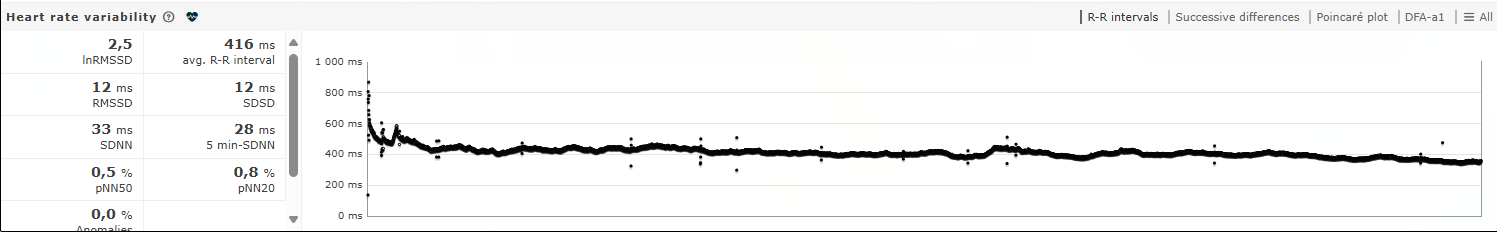 I’ll skip screenshots from the BeltDown-ModuleUp (Pulse OK, HRV OK) session Wed 30/7 since it was so clean in both areas. I’m using the OHR of a Garmin FR955 with the old Firmware 19.18 as control - normal result is +1 to +2 bpm against both a Polar H10 and the Suunto belt at all kinds of running efforts (my skin/wrist really agrees with OHR, also on the Race S).