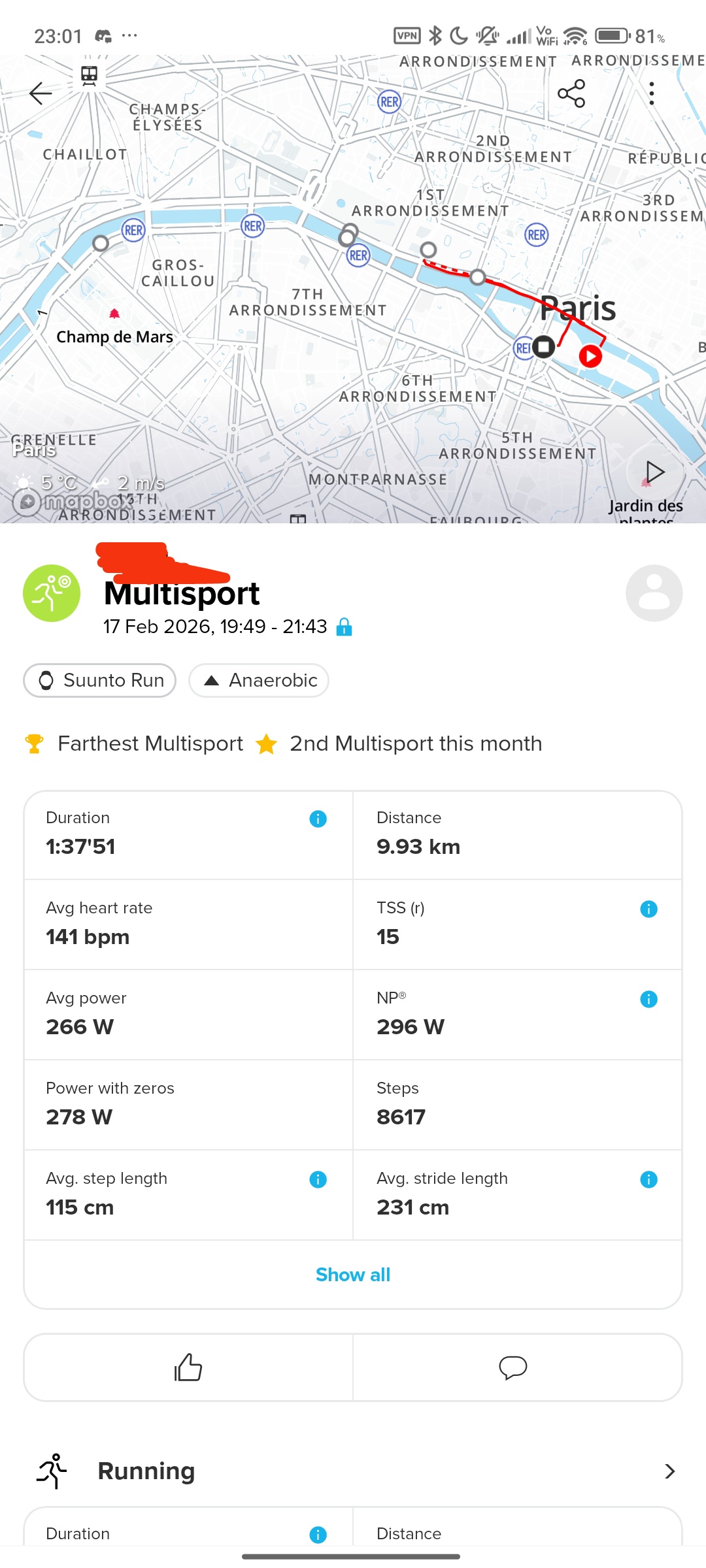 I have experienced a weird bug using the multisport function for the second time. I was switching between running and crosstraining, and the map on the Suunto app appears to be buggy (doesn’t display most of the run, and so do some graphs). An issue with the TSS is also appearing as it has not been summed, only one of the runs (15 TSS) appears as the total TSS even though the full TSS (when I summed every TSS from the watch) should be of 84.