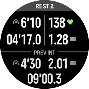 I finally reached a solution I’m happy with for the PREV INT panel: bigger text, three values shown at the same time, and rotation between distance and average HR. Check out version 1.5!