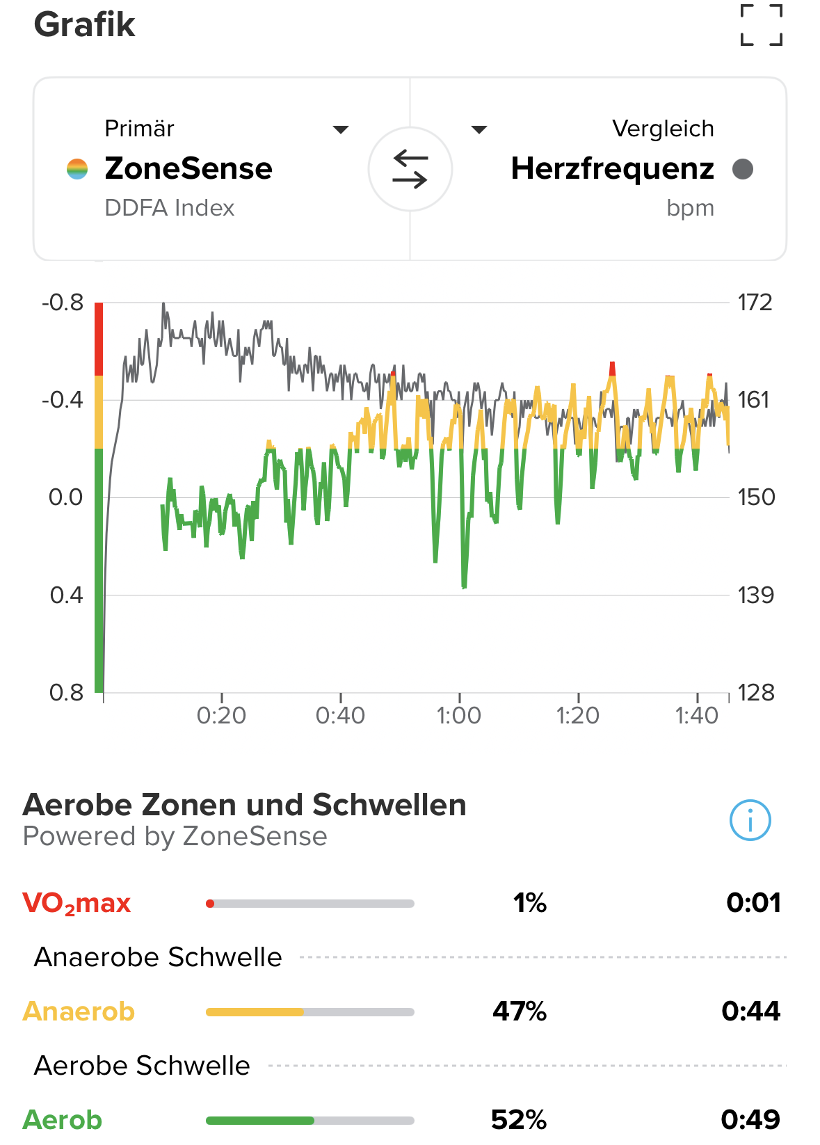 Ran a half marathon yesterday and I’ve seen a slow drop of my heart rate over the distance, although I almost managed to keep up the pace. But comparing it to ZoneSense data, you can clearly see the increasing fatigue and bringing even that lower heart rate in higher zones than usual.